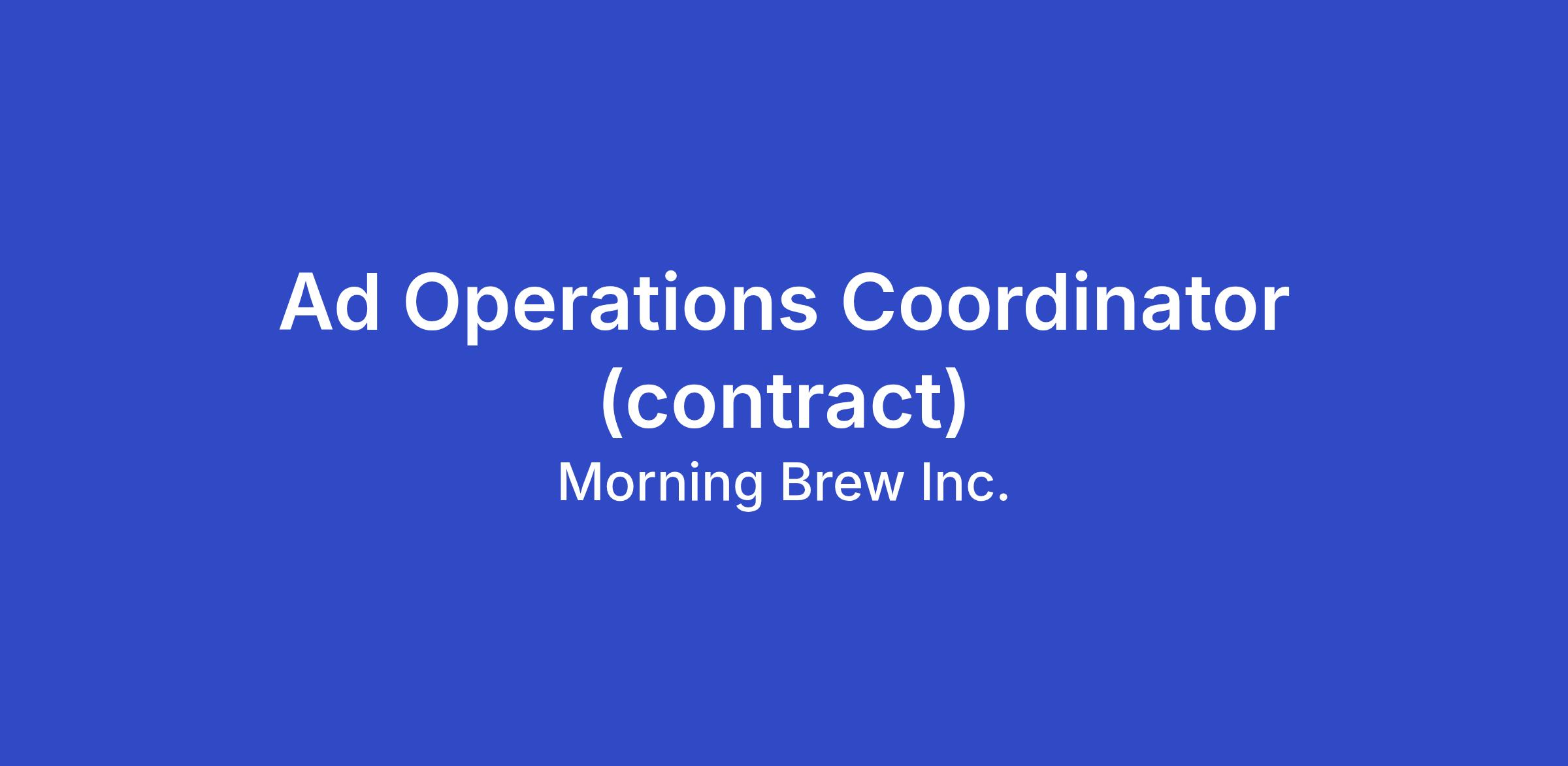 Morning Brew Inc. is looking for a contract Ad Operations Coordinator to provide maternity leave coverage on our Ad Ops team. This is a part-time engagement (~20 hrs/week) focused on ad trafficking support for our audio revenue channels.