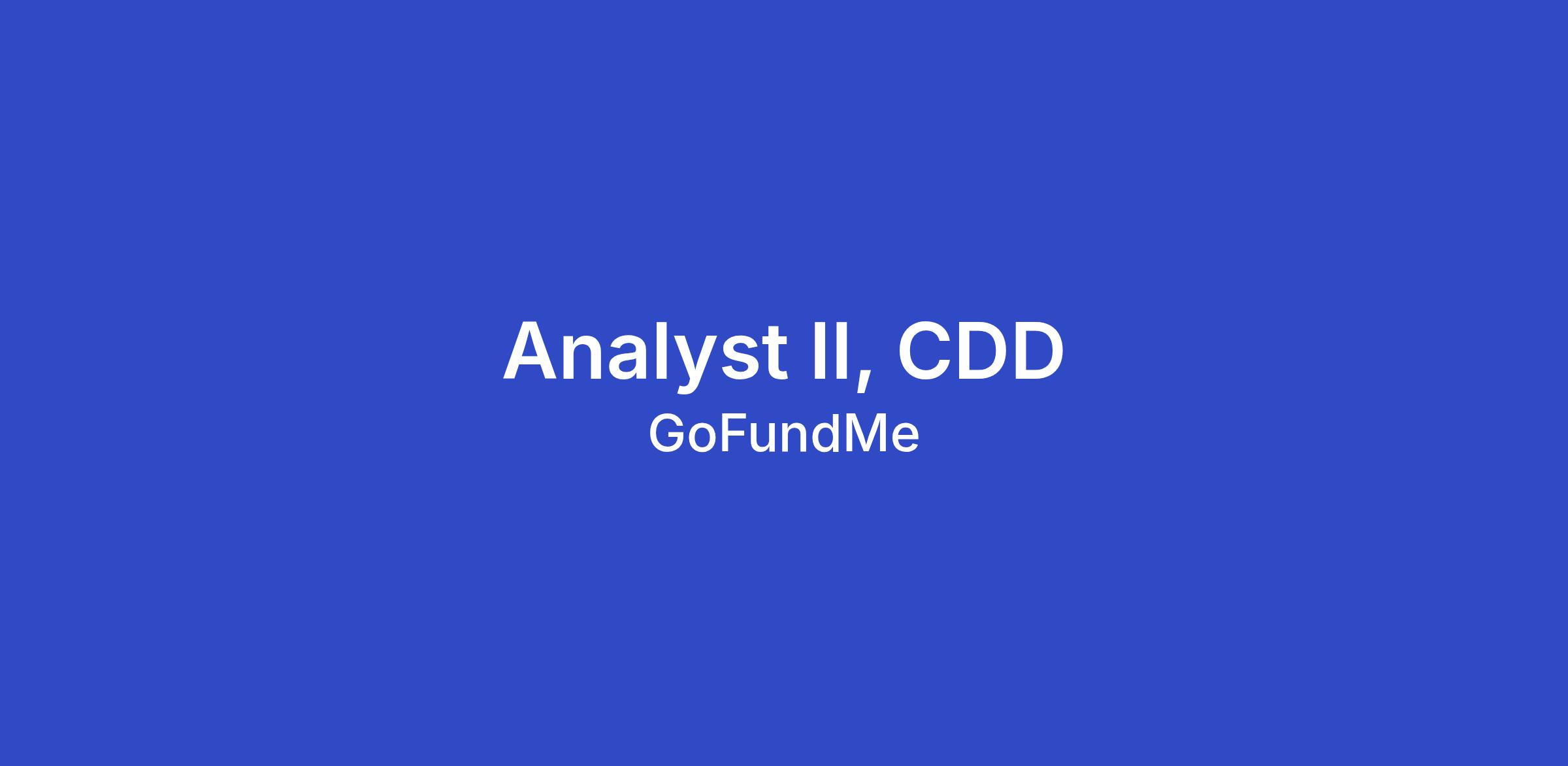 Join us! The GoFundMe team is searching for a skilled and passionate Analyst II to join our global Trust & Safety team. In this dynamic role, you will be required to operate at an impeccable level of consistency while mastering new techniques and technologies to ensure GoFundMe remains a safe place to give and receive donations online.
