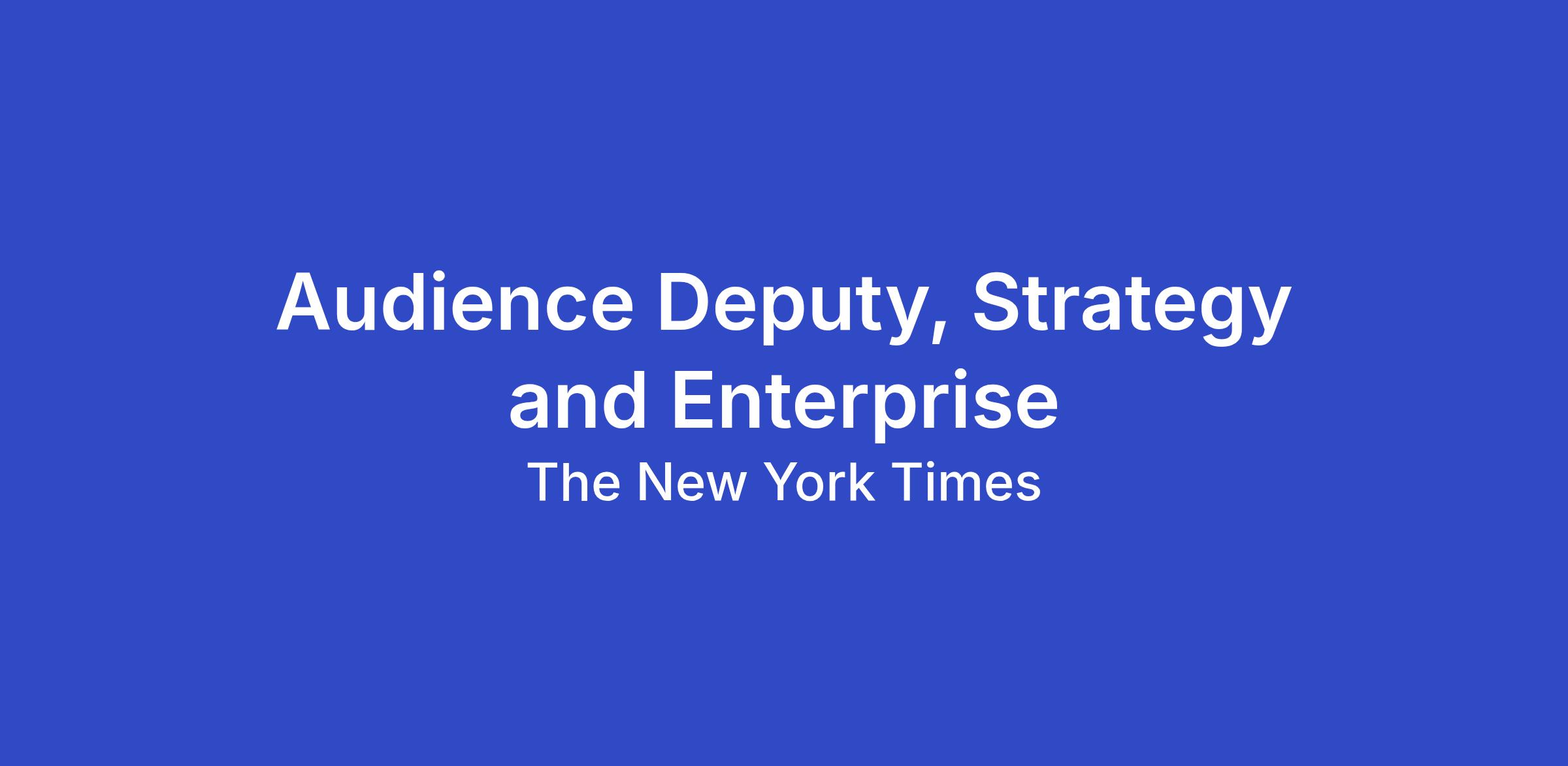 The New York Times is seeking an Audience Deputy, Strategy and Enterprise to define and action ambitious new approaches for growing our global readership. This person will act as the primary bridge between the newsroom and key enterprise departments like Product, Partnerships, Growth and Comms on newsroomwide priorities to ensure we are pulling all editorial and product levers to build engaged audiences at scale. You will report to the Newsroom Audience Director, helping them ensure our audience strategy is both ambitious and operationally rigorous as well as defining team norms and career ladders to support managers across functions.