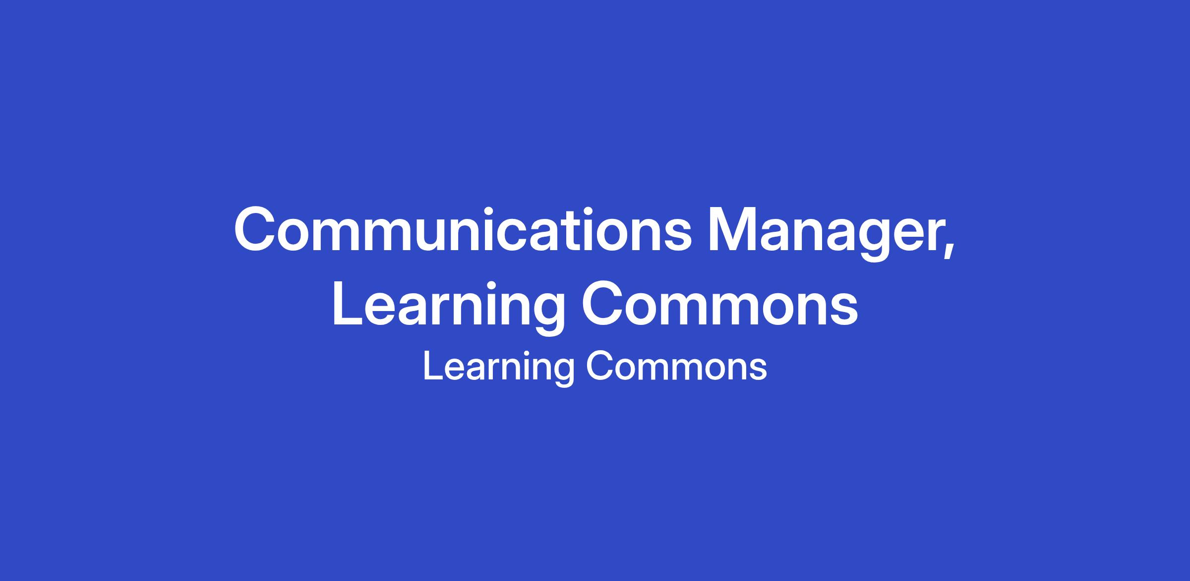 The Communications Manager role is an opportunity to manage strategic communications for Learning Commons. In this role, you will plan and coordinate integrated storytelling opportunities across Learning Commons’s partnerships and tools. This role sits on the Brand and Communications team and reports to the Vice President of Communications for Learning Commons and Ventures.
