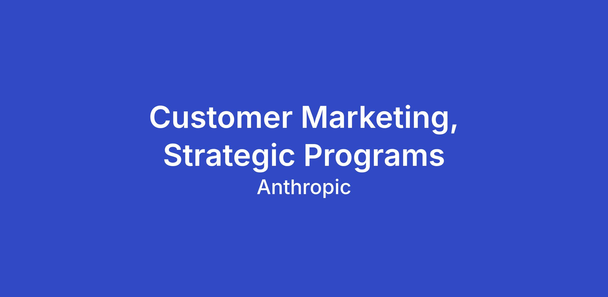 Anthropic is seeking a Customer Marketing, Strategic Program Manager to build and run the programs that put customers at the center of how we launch products and tell our story. You'll own a portfolio spanning early access for model launches, customer-facing events, analyst relations support, and voice-of-the-customer work that feeds directly back into the product roadmap. The through-line across all of it: get the right customers into the right moments—launches, stages, analyst briefings, campaigns—to ensure everything Anthropic says and does is rooted in customer proof.
