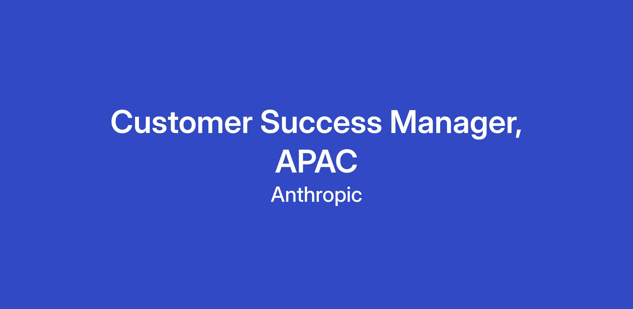 Join Anthropic's Customer Success team as our first APAC-based Customer Success Manager as we pioneer the future of enterprise AI adoption. As a Customer Success Manager at Anthropic, you'll be the strategic partner and trusted advisor to our most complex customers across Asia-Pacific helping them harness the full potential of all our Claude capabilities - API, Claude for Enterprise, and Claude Code.
