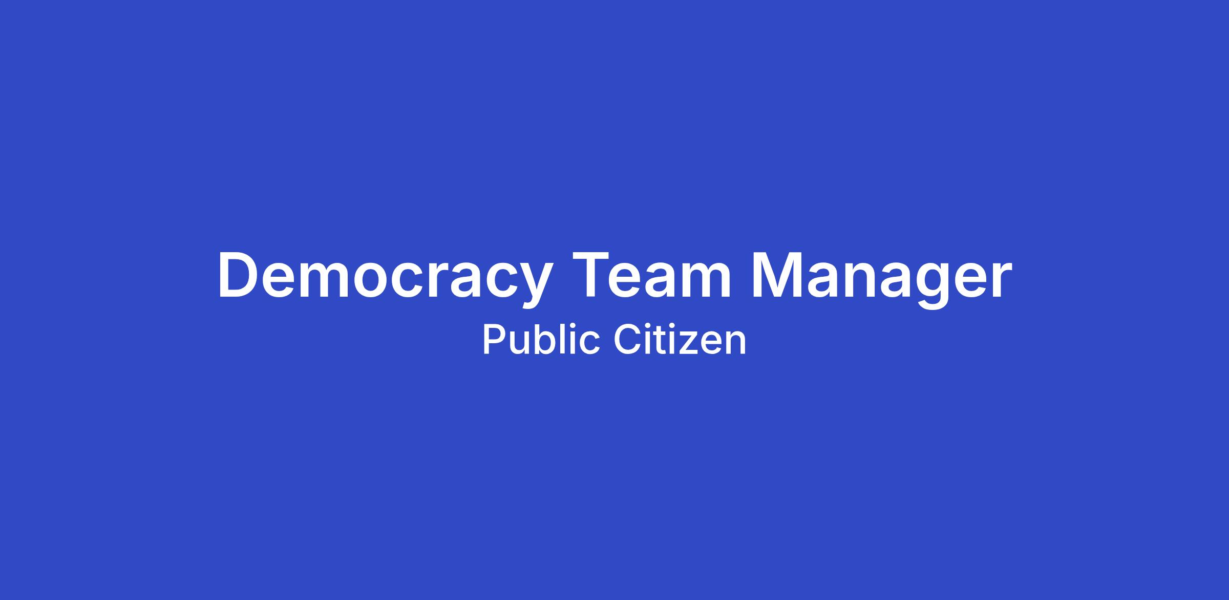 Public Citizen seeks a strategic, energetic, and experienced leader to serve as a people-centered Team Manager for our Democracy Campaign. The Team Manager will work closely with the Democracy Campaign Co-Directors to manage a team and build large-scale grassroots action and strategic campaigns to counter efforts to undermine our democracy and the rule of law, target vulnerable communities, dismantle essential programs, and weaken institutions of civil society.