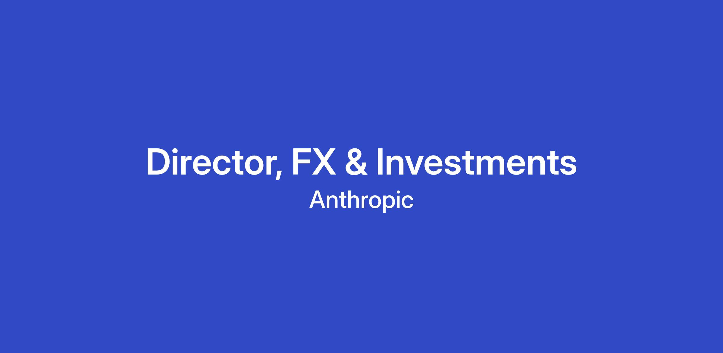 Anthropic is seeking a Director, FX & Investments to join our Treasury team. In this foundational role, you will build and lead Anthropic's foreign exchange, investments, and risk management programs from the ground up. As we experience exponential growth, you will be instrumental in ensuring optimal capital allocation, protecting our financial assets, and establishing the policies and infrastructure needed to support our expanding global operations. This role reports directly to the Treasurer.