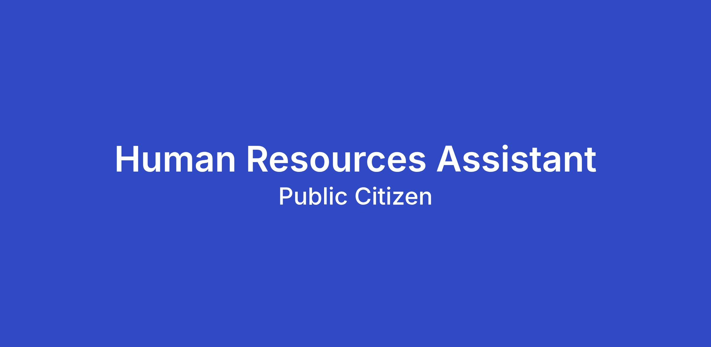 GENERAL DESCRIPTION: The human resource assistant will support the human resource department. The human resource assistant will assist with the lifecycle of an employee which include, hiring, during employment and exiting Public Citizen. It is the human resource department’s responsibility to ensure the employees at Public Citizen is working in a harmonious work environment and have the tools they need to do their job.