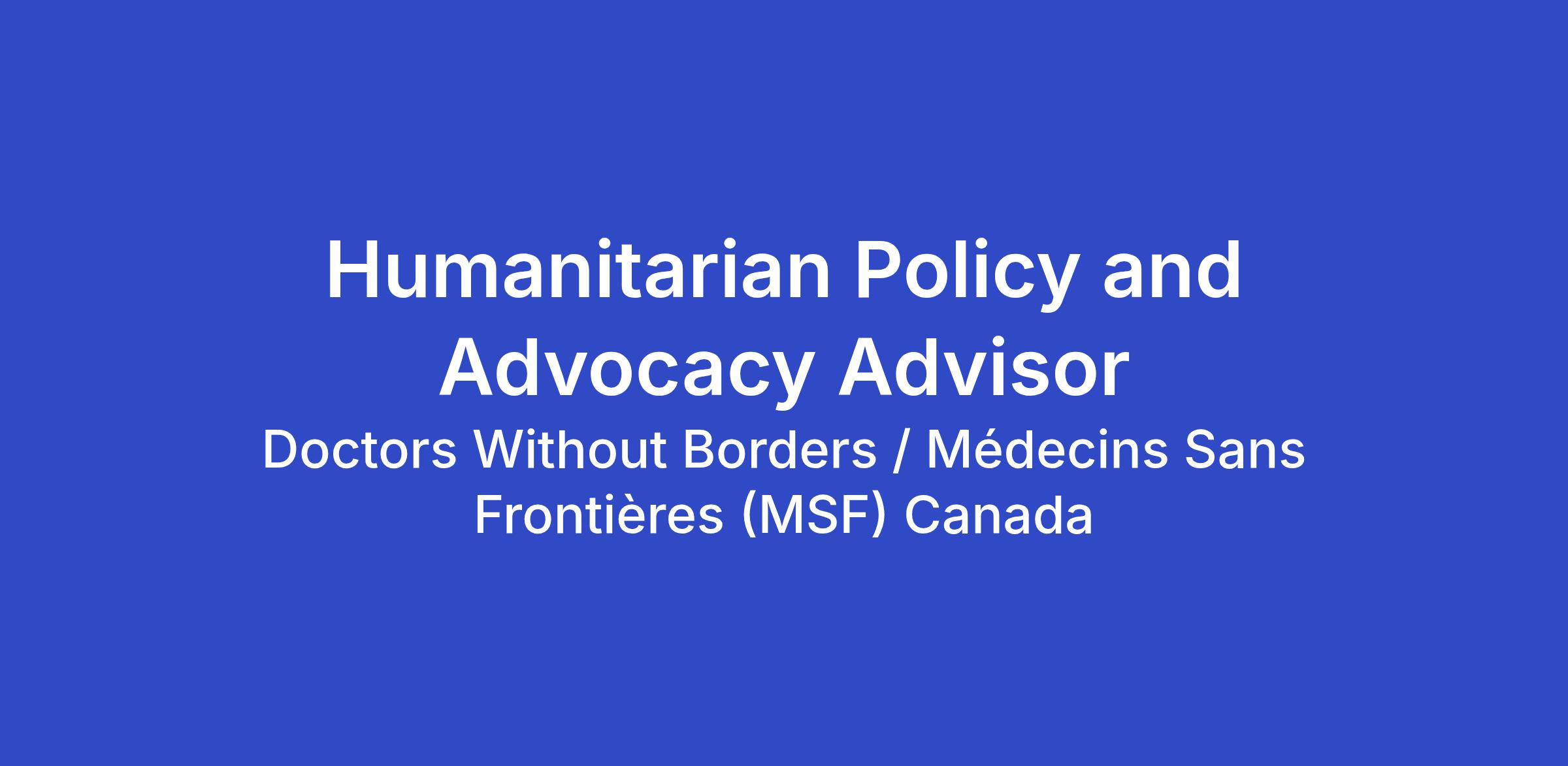 The Humanitarian Policy and Advocacy Advisor helps shape MSF Canada’s policy positioning and analysis on humanitarian issues in Canada that are relevant to MSF’s global medical-humanitarian priorities, and helps develop advocacy strategies to influence Canadians, especially policy makers and other stakeholders, to take actions that will positively impact MSF’s patients and operations around the world. Drawing on a knowledge of international humanitarian contexts, of the global aid system, and of humanitarian policy at Canadian and global levels, the Humanitarian Policy and Advocacy Advisor reports directly to MSF’s Humanitarian Representative to Canada and will build relationships and work collaboratively with experts inside and outside of MSF to improve Canada’s response to global humanitarian needs.