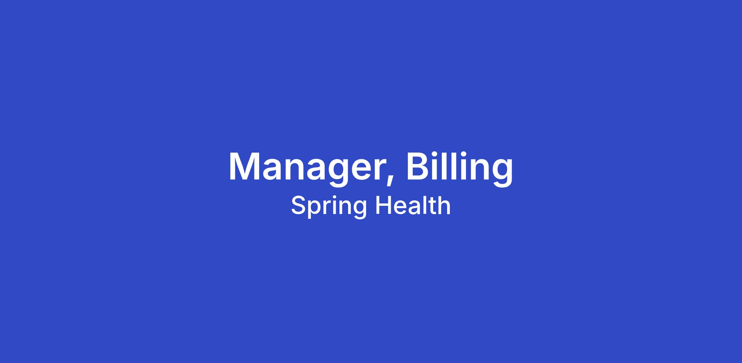 Reporting to the Associate Director of Revenue Cycle, the Manager, Billing will lead a high-performing team responsible for managing all aspects of the billing team, which includes but is not limited to, getting all claims successfully from the point of documentation by the provider to the appropriate party for payment. This remote role is part of the Operations team and plays a critical role in ensuring a seamless and patient-centered billing experience while improving internal processes and service performance. At Spring Health we value internal mobility. We have identified a strong internal candidate for this position. We still encourage candidates to apply.