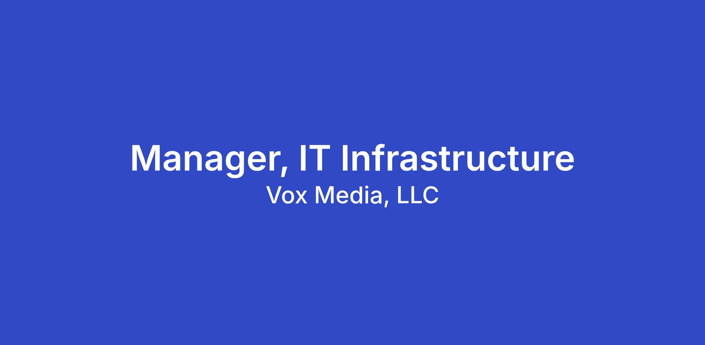 The Manager of IT Infrastructure will lead a team of IT administrators and engineers, overseeing the management of our corporate IT infrastructure. This is a hands-on role focused on key initiatives to improve and enhance our hybrid environment, which includes SaaS platforms, on-premise infrastructure, and cloud infrastructure. The Manager will report to the Sr. Director of Infrastructure and Infosec.