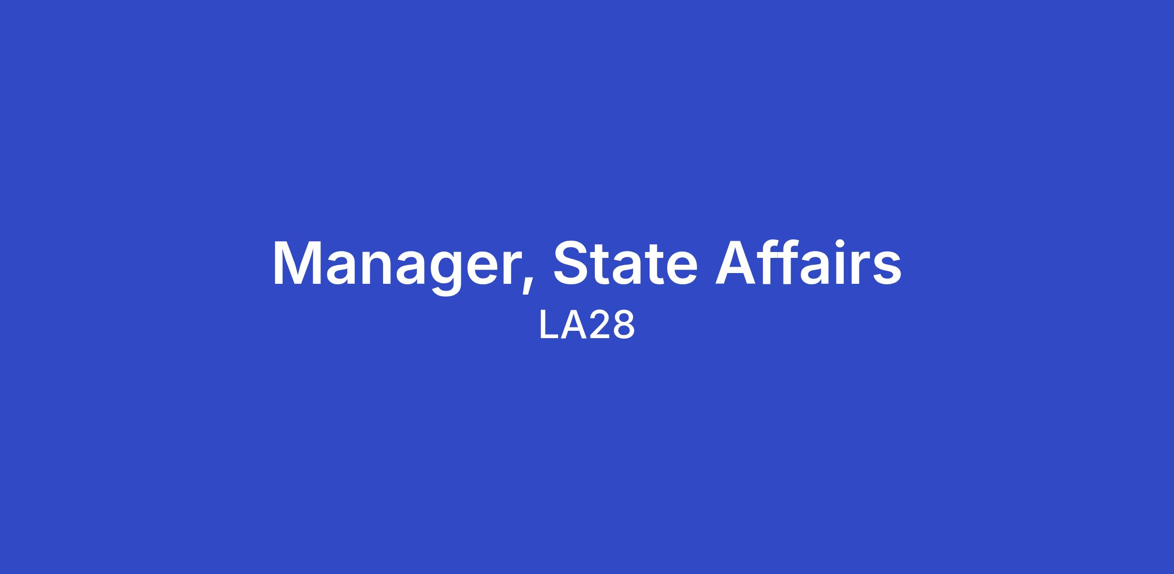 The Government Relations team builds and sustains LA28’s partnerships with elected and appointed officials at every level of government to ensure the successful delivery of the Olympic and Paralympic Games. The Manager, State Affairs will play a pivotal role in advancing LA28’s relationships with state partners in California—helping to strengthen coordination among government stakeholders and execute LA28’s state advocacy agenda.