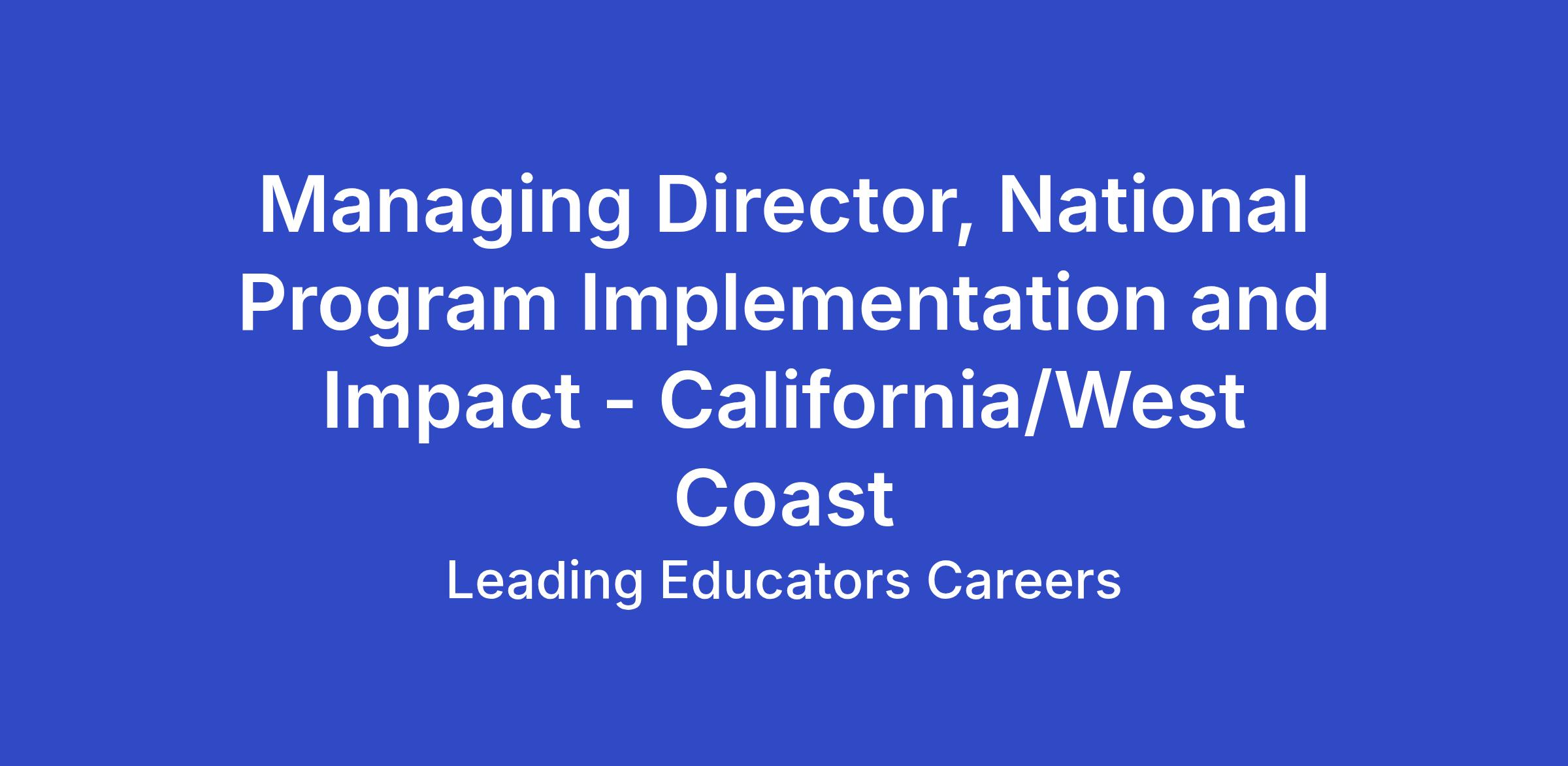 The Managing Director, National Program Implementation and Impact - California/West Coast is a strategic leadership opportunity for an experienced education leader ready to drive excellence in program implementation across Leading Educators' West Coast district partnerships, with California as our strategic priority for growth and expansion.