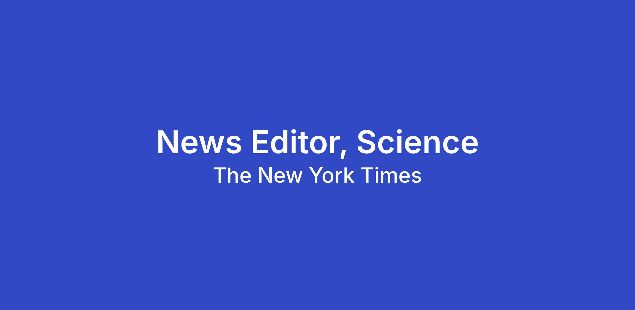 The New York Times is looking for an experienced editor to drive news coverage on its Science desk. Above all, you will need to possess excellent news judgment and a fast metabolism for executing on ideas quickly, with the ability to inspire (and cajole) a large group of reporters on a wide range of complex beats.