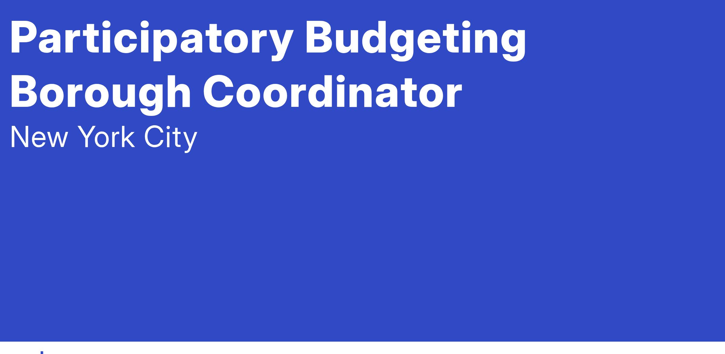 JOB RESPONSIBILITIES: The Civic Engagement Commission seeks a Participatory Budgeting (PB) Borough Coordinator for the borough of Brooklyn to support the implementation of The Peoples Money, CECs citywide participatory budgeting program. Reporting to the Participatory Budgeting Director and working closely with the CEC outreach team, the Participatory Budgeting Borough Coordinator will be responsible for working collaboratively to plan, launch and implement a citywide participatory budgeting process that builds trust and deepens meaningful engagement of residents and communities.