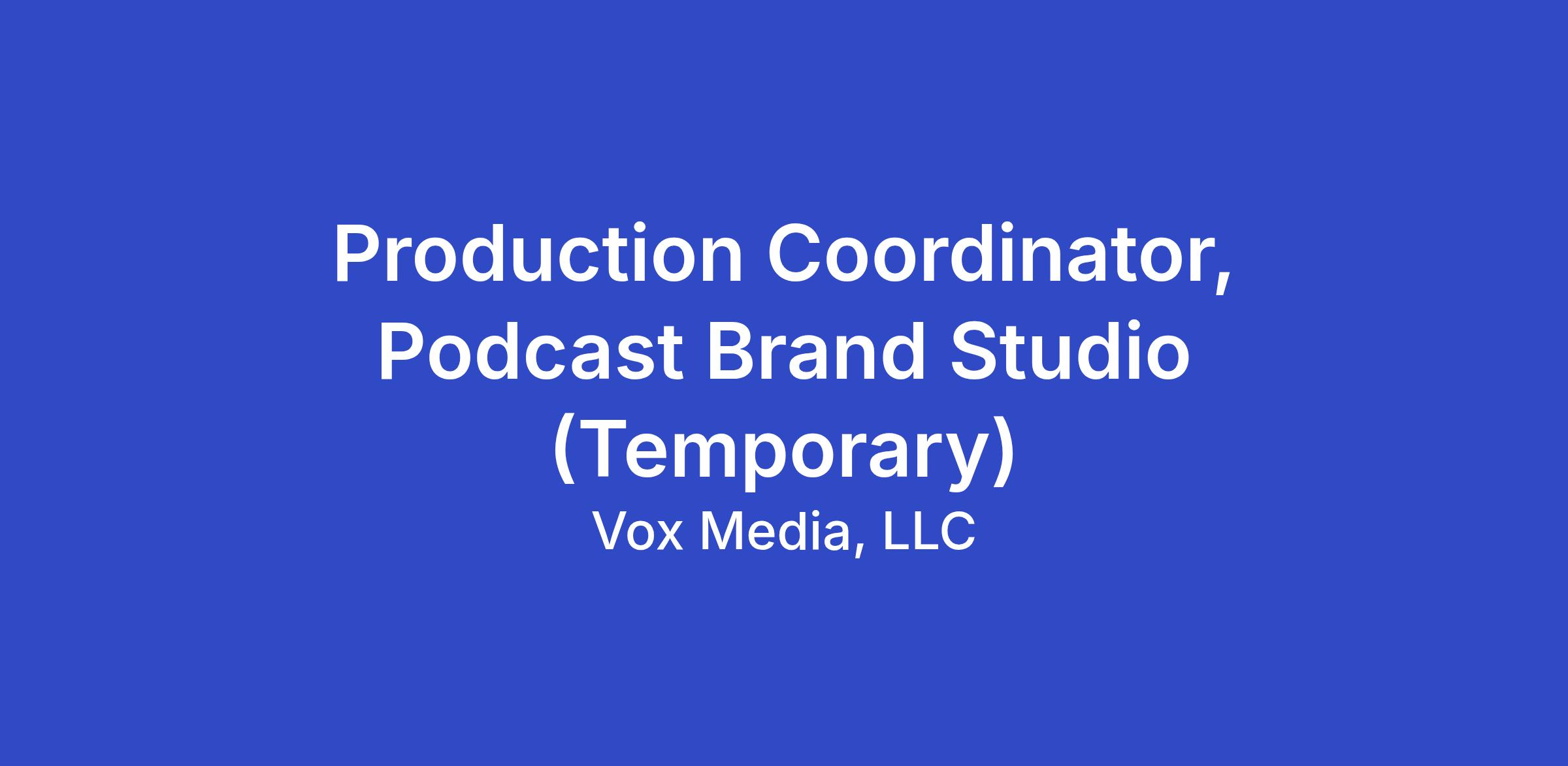 The Podcast Brand Studio is looking for a temporary Production Coordinator to support the Brand Studio Production team. The Production Coordinator will report to the Production Manager, Brand Studio. This role operates primarily within the Host & Produced Reads workstream, which encompasses all daily ad production across the whole of VMPN.