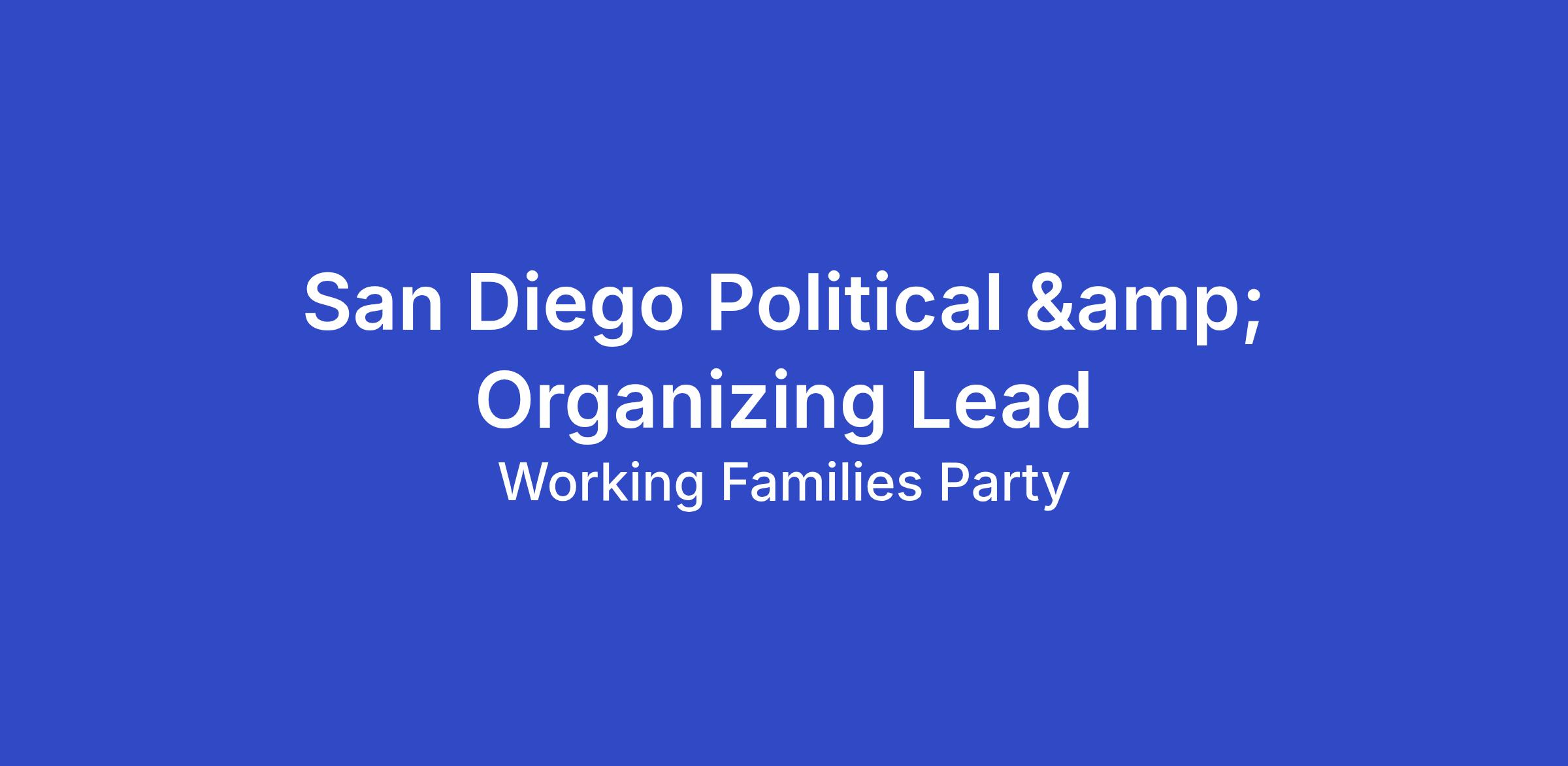 The California Working Families Party is seeking a highly strategic, senior political leader to serve as the San Diego Political & Organizing Lead, leading the Party’s electoral, organizing and coalition-building strategy in the region.
