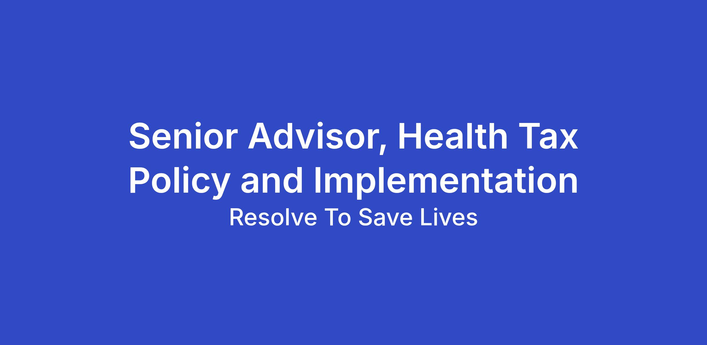 Resolve to Save Lives (RTSL) seeks a Senior Advisor, Health Tax Policy and Implementation to provide strategic, technical, and operational leadership for our global health taxes portfolio, with a focus on taxes on tobacco, alcohol, and unhealthy food. The selected individual will shape and oversee RTSL’s work on health taxes across current geographies and explore support for additional countries. In the first year, the Senior Advisor will prioritize strengthening implementation in Zambia, elevating lessons learned on tax administration, and supporting targeted fundraising and positioning efforts. Success will be measured by the implementation of stronger health tax policies that raise revenue, reduce consumption of harmful products, and withstand industry pressure.