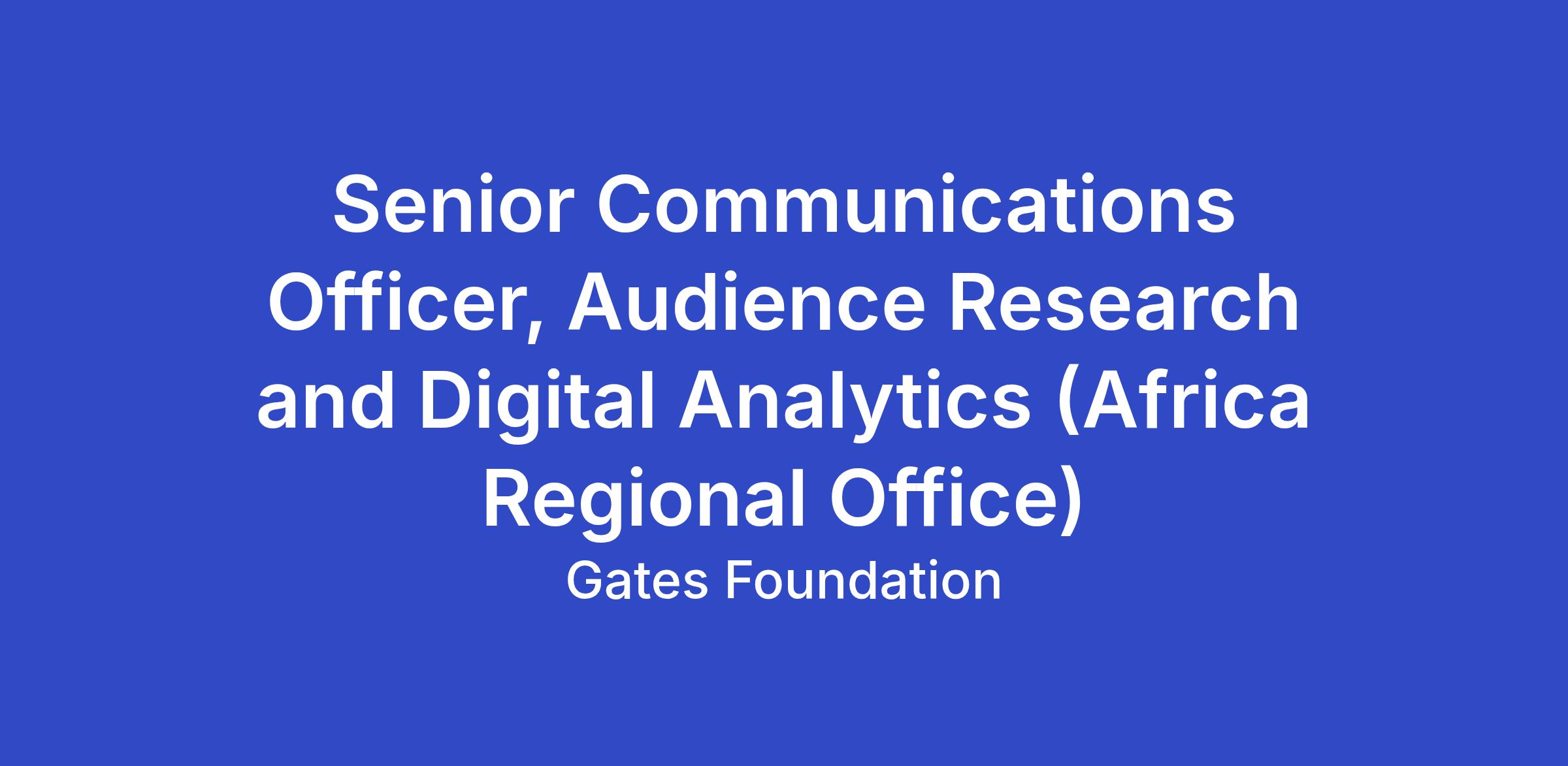 As Senior Communications Officer, Audience Research and Digital Analytics (Africa Regional Office), you will lead communications measurement, evaluation, and audience research to inform and strengthen the foundation’s communications strategies across Africa (in particular Kenya, South Africa and Nigeria). You will translate data from social listening, media monitoring, and public opinion research into actionable insights that shape communications activities, issues management, and engagement with diverse audiences across the region. You will also manage external research and analytics partners and help maintain and develop a culture of evidence-based communications.