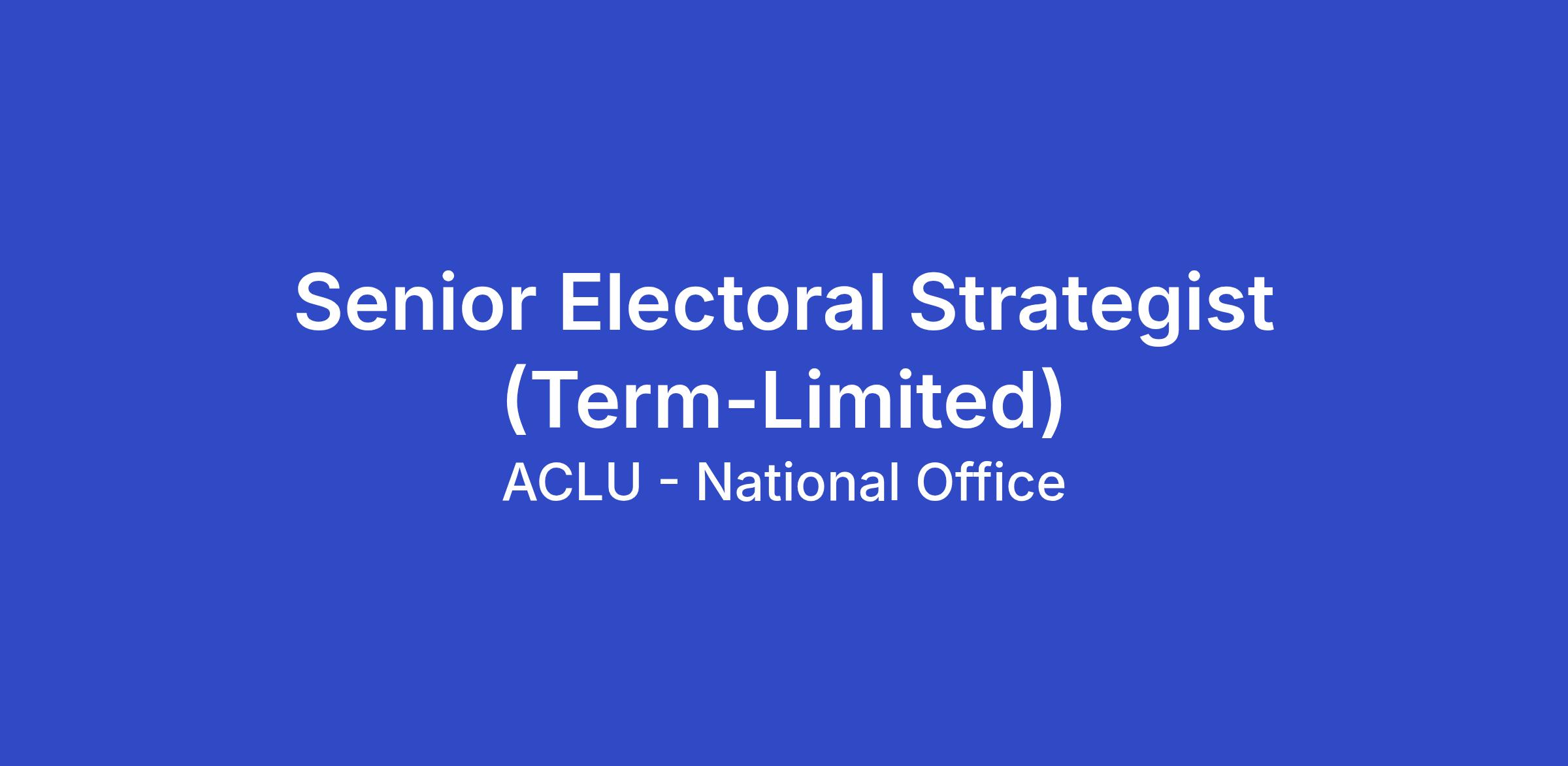 The ACLU is seeking to fill a full-time term-limited position of Senior Electoral Strategist in the National Political Advocacy Department of the ACLU’s National office in Washington, DC or New York, NY. This is a hybrid role that has in-office requirements of two (2) days per week or eight (8) days per month. This position may be eligible for remote work in the United States.