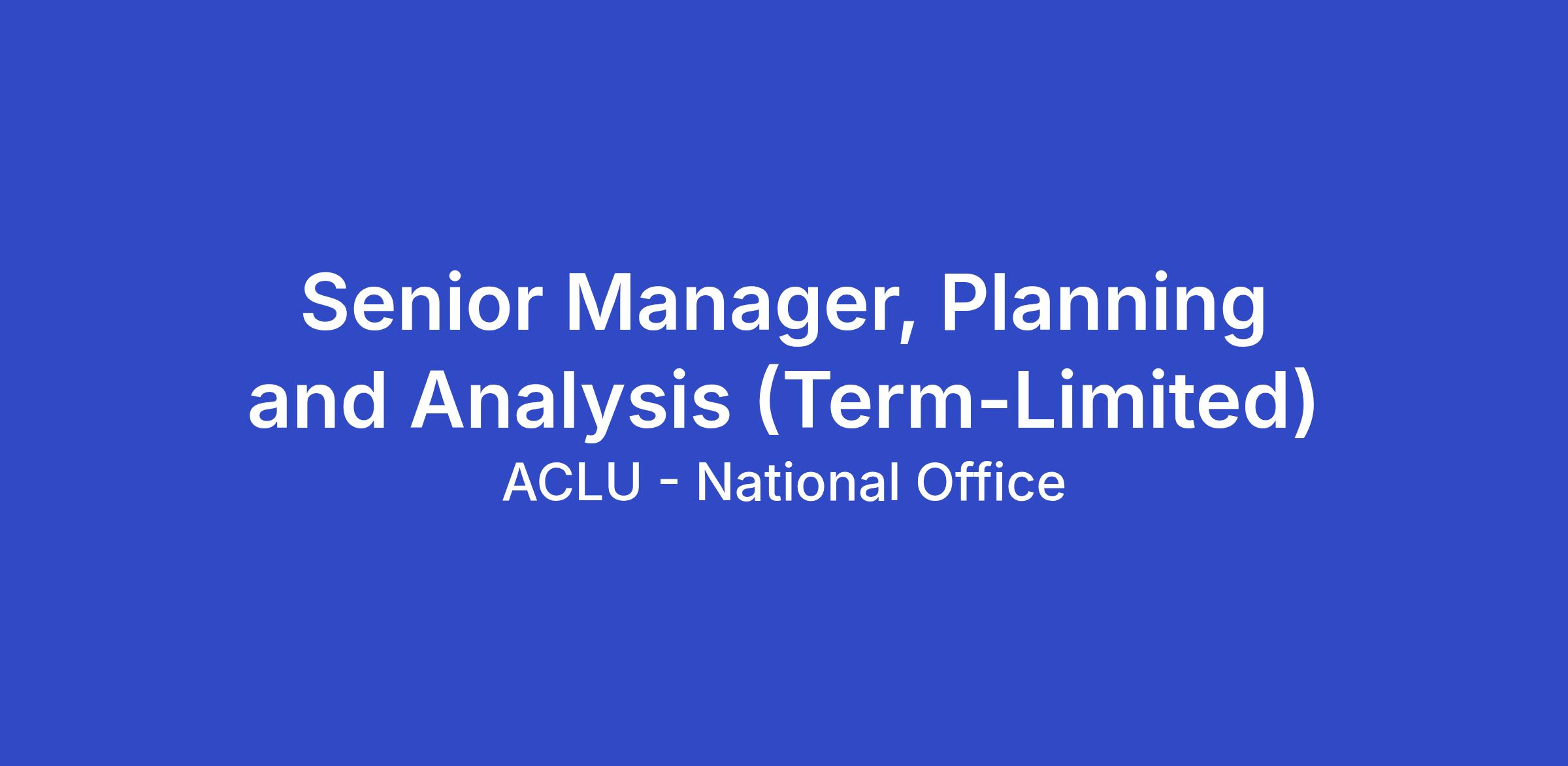 The ACLU seeks a full-time position of Senior Manager, Planning and Analysis in the Strategy Office of the ACLU’s National office in New York, NY or Washington, DC (with a preference for NY). This is a hybrid role that has in-office requirements of two (2) days per week or eight (8) days per month. This is a two and a half-year term-limited position.