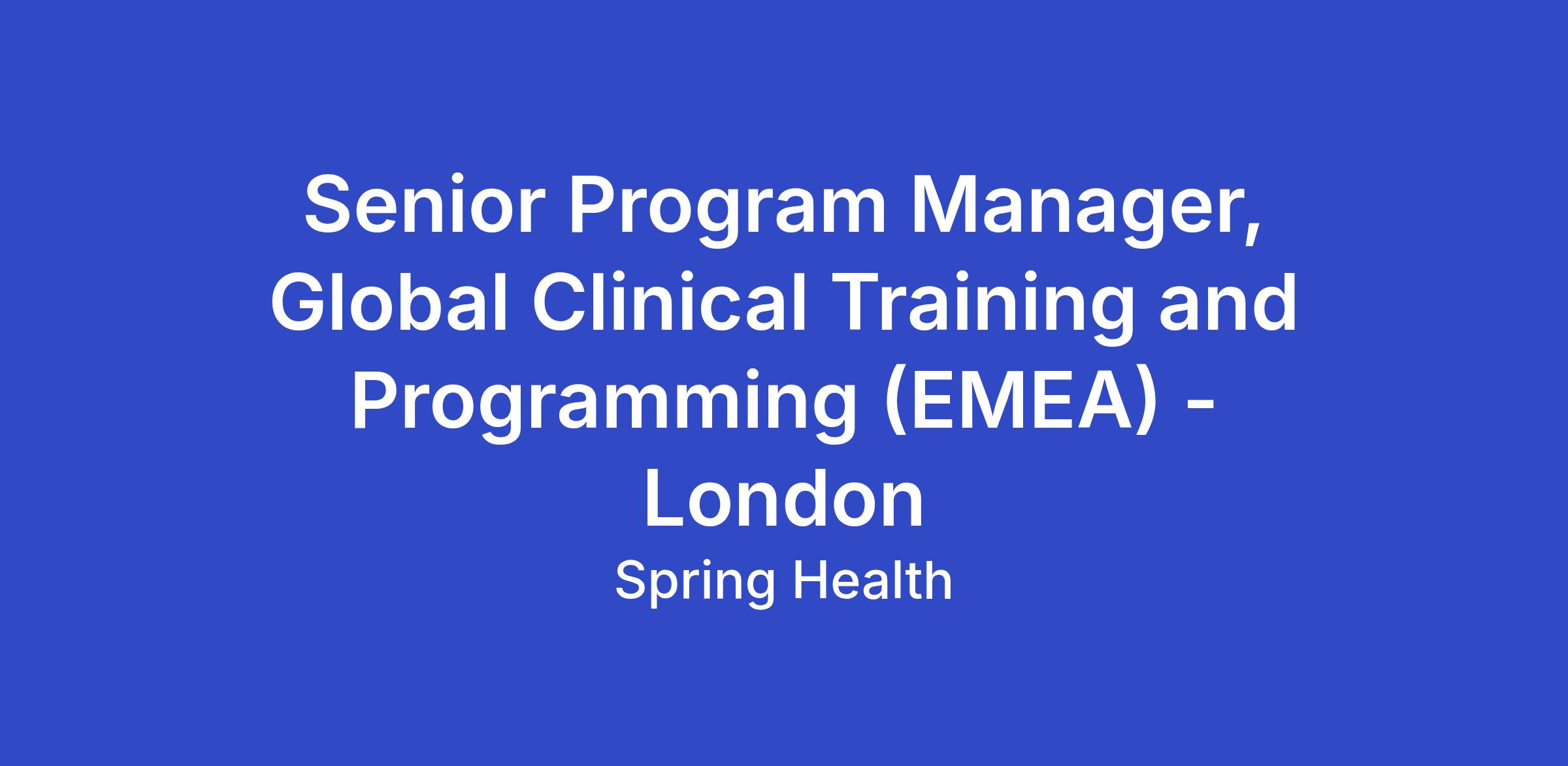 Reporting to the Director of Clinical Training, the Senior Program Manager, Clinical Training and Global Programming will develop the strategy for Spring Health’s global training and programming, serve as the SME for global webinars/WellSprings, coordinate the logistics for training and programming, ensure quality member experience for the global population, meet with customers to develop customized training and programming for our larger global accounts. This is a full time remote position seated in Europe, Middle East, or Africa. Travel will be required up to 30% of the time for in person trainings.