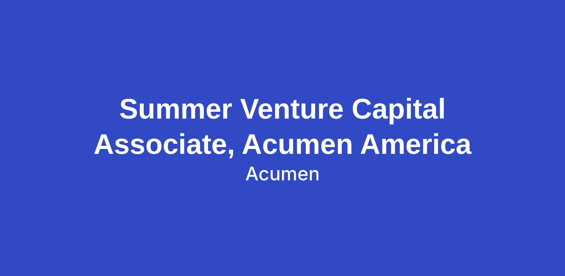 Acumen America is seeking a Summer Venture Capital Associate with a passion for investing, impact, and technology to help support our growing U.S. portfolio. This is an outstanding opportunity for someone with strong investment judgment, financial analysis skills, exceptional energy, and a proven commitment to social change.