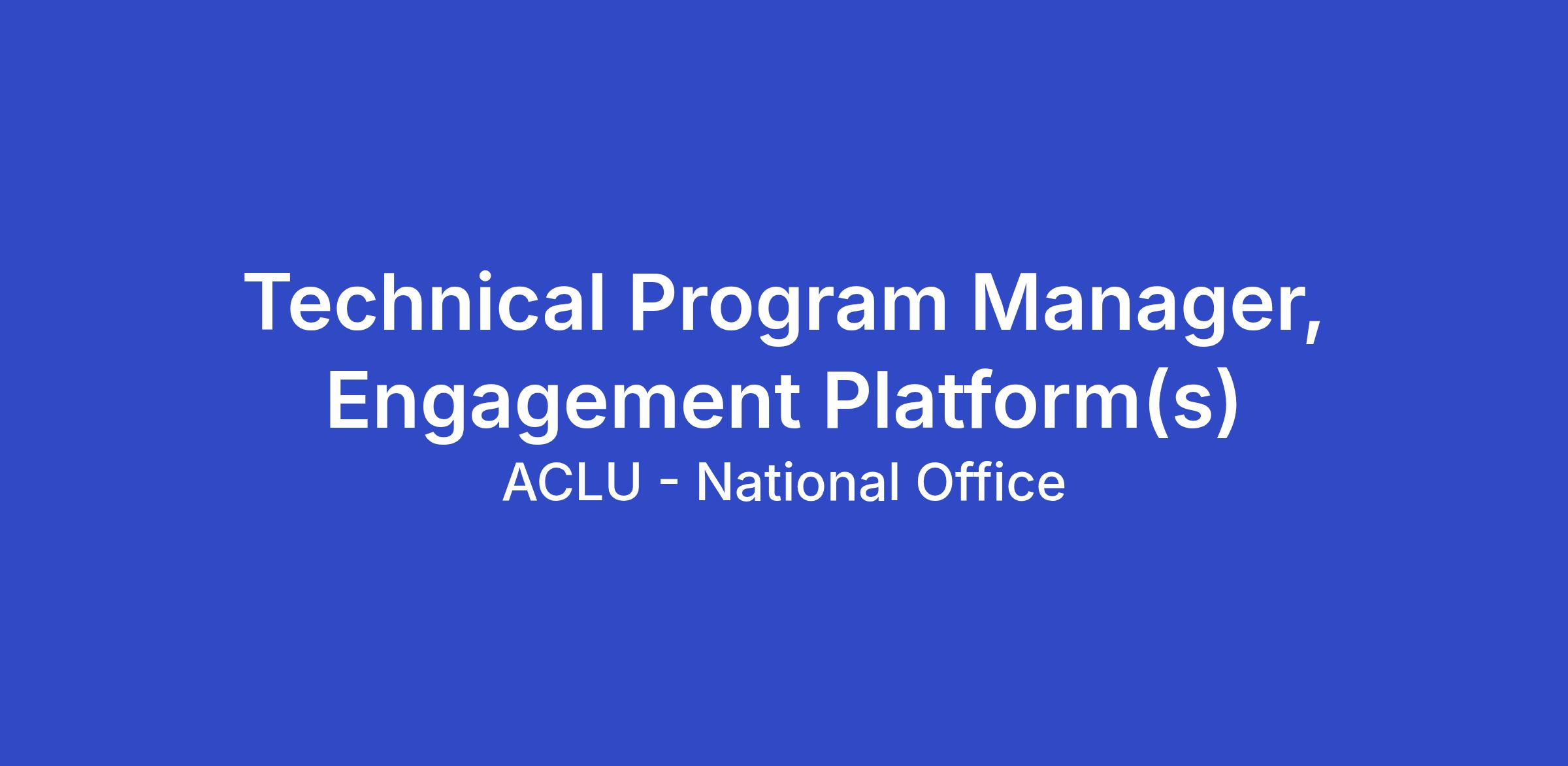 The ACLU seeks applicants for the full-time position of Technical Program Manager, Engagement Platform(s) in the Technology Department of the ACLU’s National office in New York, NY. This is a hybrid role that has in-office requirements of two (2) days per week or eight (8) days per month.